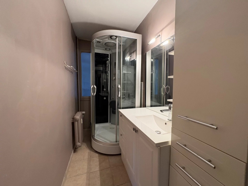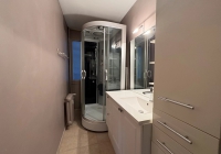 Une salle d’eau avec meuble 1 vasque (miroir) et emplacement pour machine à laver,