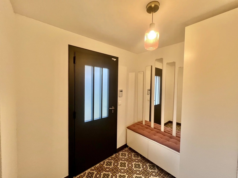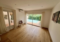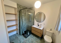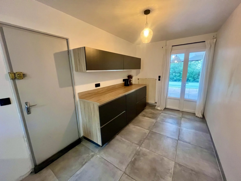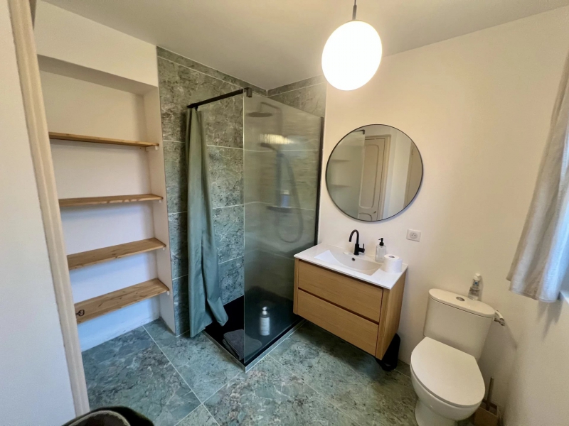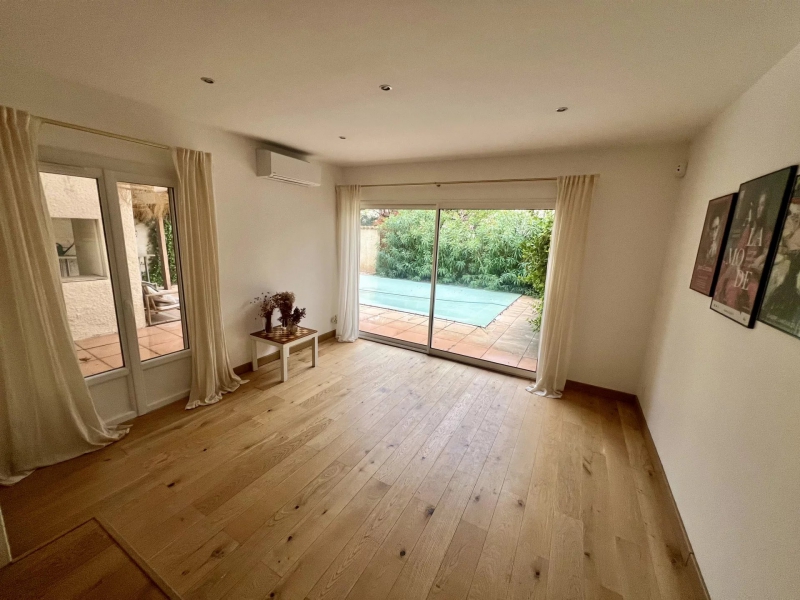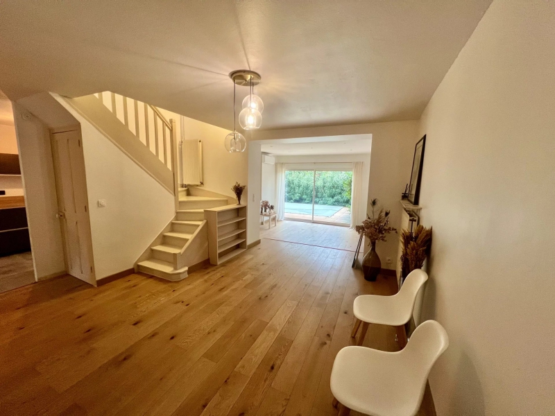 Ce bien sur 2 niveaux, entièrement rénové avec beaucoup de goût, offre au rez-de-chaussée, une entrée avec placards, une salle d'eau avec WC, une belle pièce de vie, une cuisine équipée semi ouverte donnant sur la terrasse, un agréable coin barbecue protégé et une piscine.